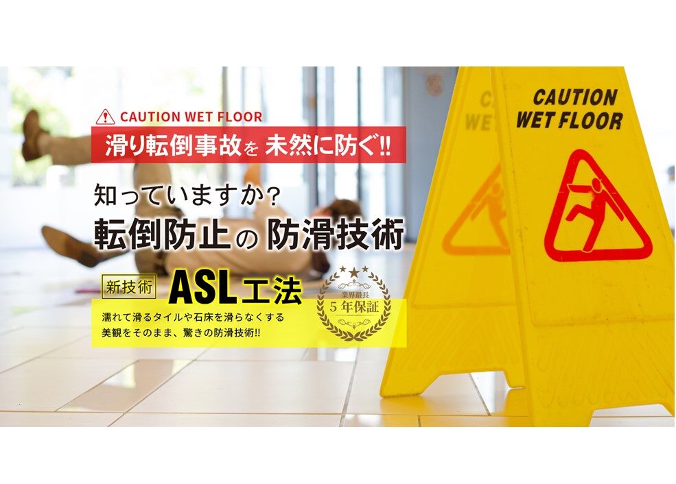 濡れると滑る危険なタイルや石の床を、「滑らない床」に加工するのがASL工法防滑加工工事です。コーティングのような被膜処理ではなく、素材そのものに滑り止め効果をプラスします。その特徴は「超防滑」「高耐久」「短時間施工」「低コスト」。さらに「見た目にほとんど変化なし」。美観を損ねず滑り転倒リスクを軽減します。意外に多い「滑り転倒事故」。あなたや、あなたの大切な人の安心で安全な生活を手助けする、そんな次世代の防滑加工技術が「ASL工法」です。(一般社団法人アンチスリップラボ会員)