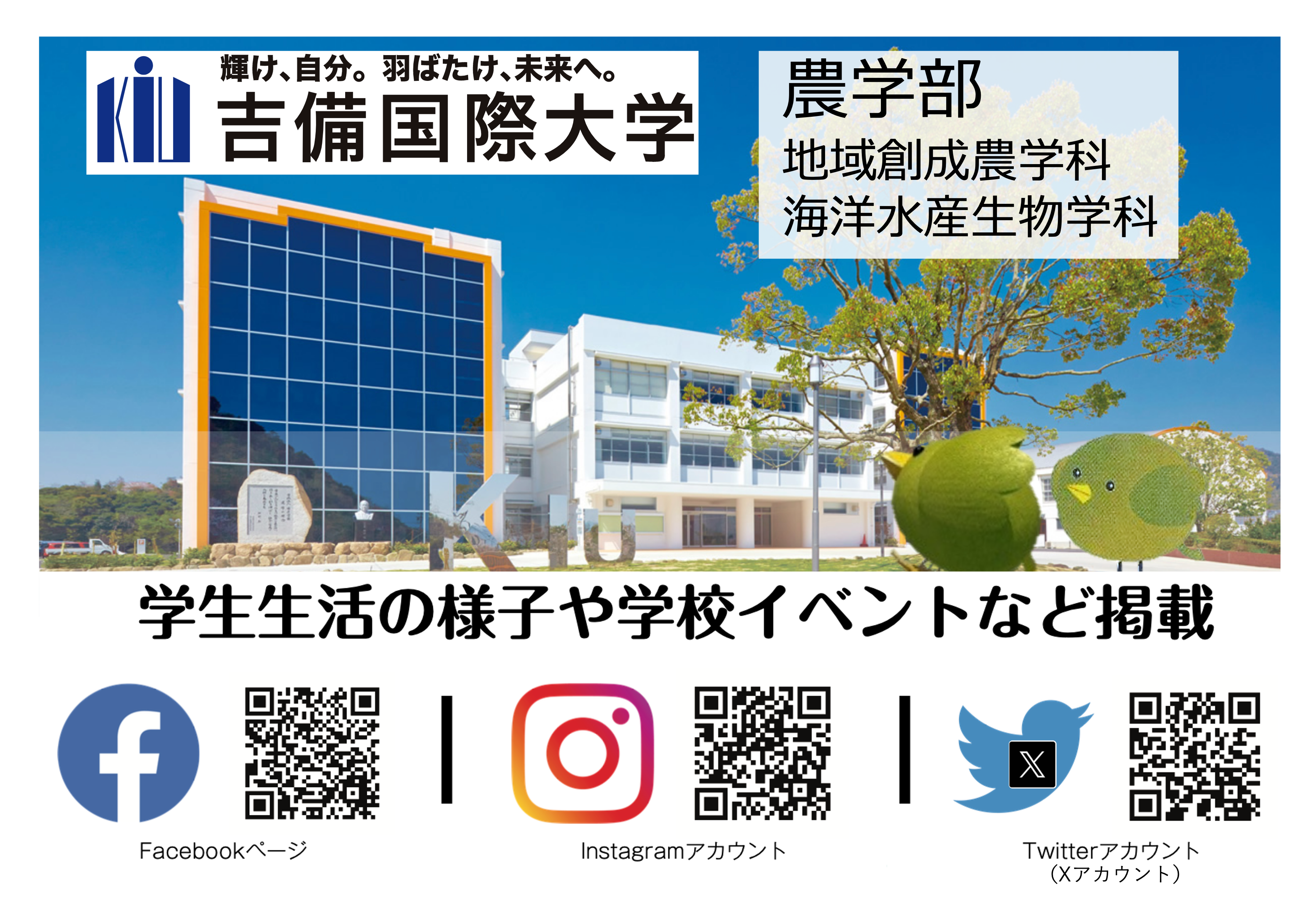 吉備国際大学・農学部2学科(地域創成農学科・海洋水産生物学科)の研究教育関連活動について、コラボ開発品、実習用品、ポスター、パンフ、スライドショー・動画等によりご説明いたします。配布物をぜひお持ち帰りいただき、今後のコラボ研究や進路のご参考にしていただければ幸いです。