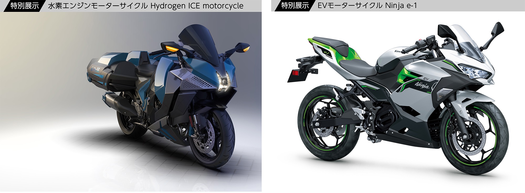 ◎水素エンジンモーターサイクル(Hydrogen ICE motorcycle)、EVモーターサイクル(Ninja e-1)